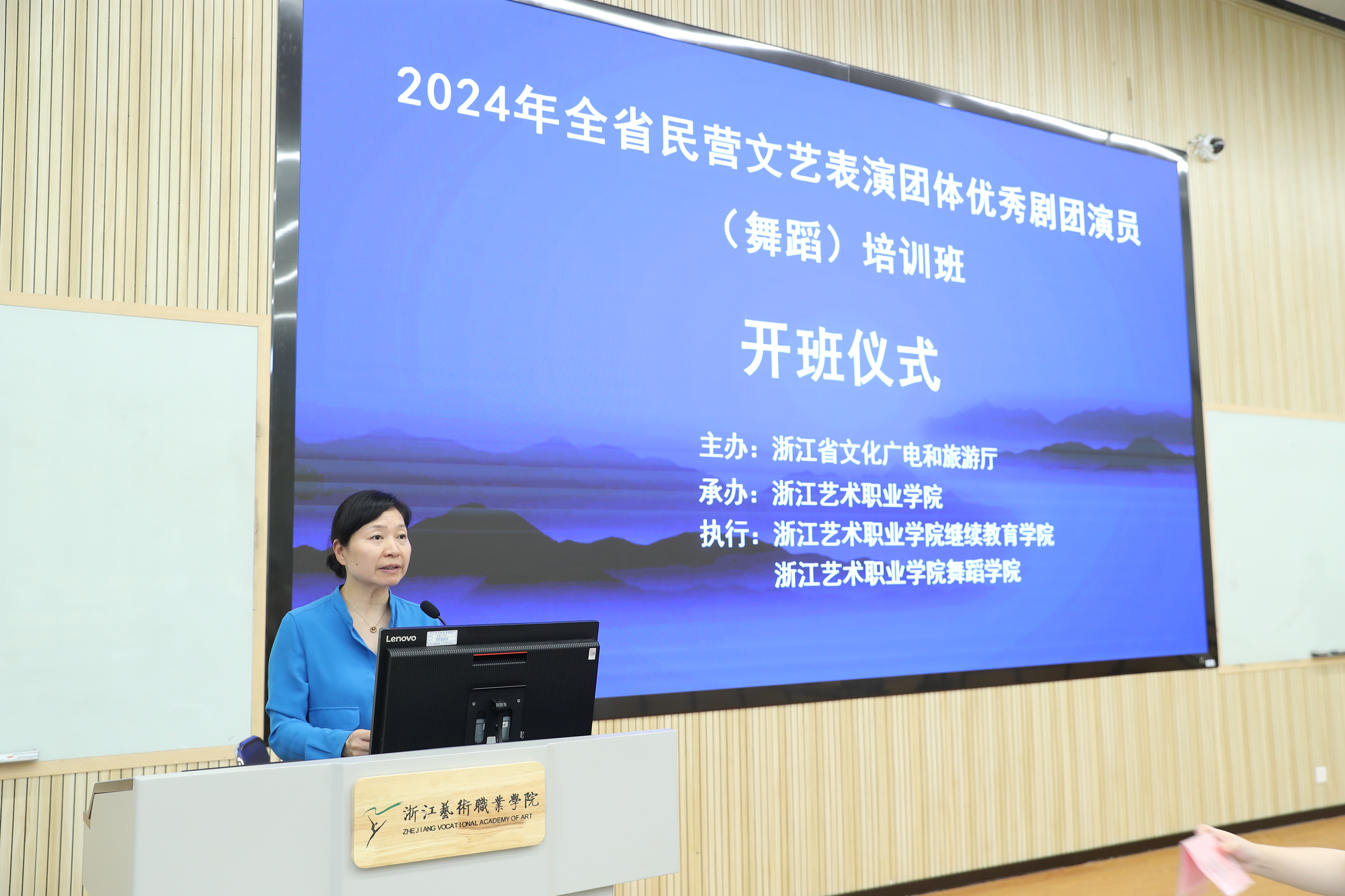 劉楊代表學(xué)校向參加本次學(xué)習(xí)的全體學(xué)員表示歡迎。她講到,從事舞蹈表演工作的演員們,用曼妙的舞姿、五彩的裝扮奉獻(xiàn)了一臺臺精彩的節(jié)目,是民間舞臺上一道道靚麗的風(fēng)景,也是全省基層文藝工作和公共文化服務(wù)工作中的重要組成部分,在踐行“八八戰(zhàn)略”、助力“兩個先行”的道路上,自覺肩負(fù)起了藝術(shù)鄉(xiāng)建、精神共富的文化重?fù)?dān)。在全面貫徹黨的二十大精神和習(xí)近平總書記考察浙江重要講話精神的背景下,2024年浙江省委“新春第一會”聚焦了人才強(qiáng)省建設(shè),今年也是我校在省文化廣電和旅游廳指導(dǎo)下連續(xù)第三年承辦民營文藝表演團(tuán)體優(yōu)秀劇團(tuán)演員(舞蹈)培訓(xùn)班,意義和責(zé)任重大。她簡要介紹了校史、辦學(xué)特色和辦學(xué)優(yōu)勢,勉勵大家珍惜機(jī)會,遵守紀(jì)律,學(xué)有所獲。