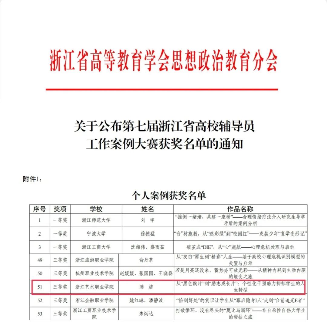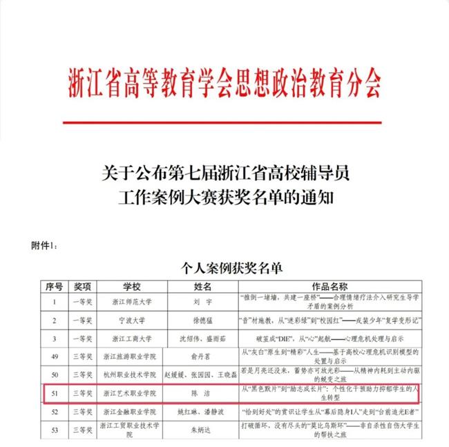近日,浙江省教育廳宣傳教育與統(tǒng)戰(zhàn)處、浙江省高等教育學(xué)會思想政治研究分會公布第四屆浙江省高校網(wǎng)絡(luò)教育優(yōu)秀作品大賽和第七屆浙江省高校輔導(dǎo)員工作案例大賽獲獎名單,我校輔導(dǎo)員獲得二等獎1項,三等獎2項的好成績。