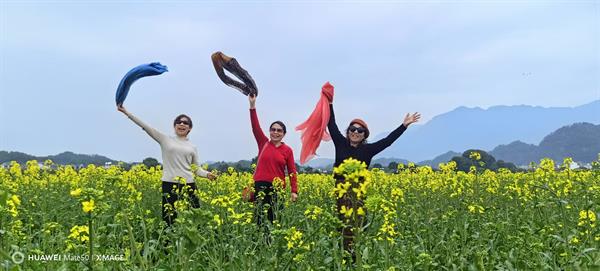午后時分,陽光傾灑而下,暖而不燥,微風輕柔拂動,恰似大自然最溫柔的輕撫。老同志們滿懷期待地踏入下江村油菜花田,剎那間,一片浩瀚無垠的金色海洋撲面而來,與澄澈湛藍的天空、潔白如雪的云朵相互映襯,勾勒出一幅如夢如幻、美不勝收的春日巨制。老姐妹們手挽手、肩并肩,三兩成群地漫步于花海之間,她們或是輕嗅那馥郁芬芳的花香,或是精心挑選角度,用相機定格下這美好的瞬間,歡笑聲此起彼伏,在花海中久久回蕩,盡情沉醉于這春日限定的浪漫時光,讓身心與大自然完美交融。