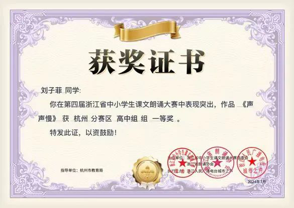 2024年參賽作品榮獲第四屆浙江省中小學(xué)課文朗誦大賽決賽高中組特等獎一名、省一等獎一名、市級一等獎四名