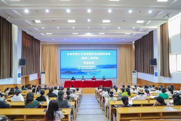 在音樂黨課開始前,2025年全省民營文藝表演團(tuán)體優(yōu)秀劇團(tuán)演員曲藝培訓(xùn)班和服裝、化妝培訓(xùn)班舉行了開班儀式。培訓(xùn)班由省文化廣電和旅游廳主辦,浙江藝術(shù)職業(yè)學(xué)院承辦,來自全省民營文藝表演團(tuán)體近90位學(xué)員參加培訓(xùn)。省文化廣電和旅游廳藝術(shù)處二級調(diào)研員金宇華,浙江藝術(shù)職業(yè)學(xué)院黨委委員、組織部部長周應(yīng)中,設(shè)計學(xué)院院長李昌國出席開班式,繼續(xù)教育學(xué)院院長吳灌紅主持開班式。