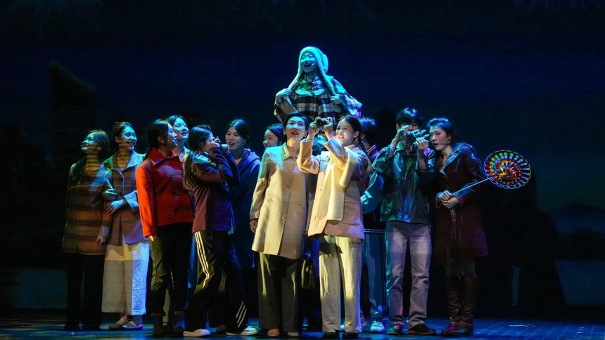 “戲劇不是造夢(mèng),是讓觀眾在別人的故事里,摸到自己的心跳。”總導(dǎo)演、浙江藝術(shù)職業(yè)學(xué)院戲劇影視學(xué)院院長(zhǎng)那剛表示,“初到杭州時(shí),這座城市給我的印象是節(jié)奏舒緩、安逸閑適,杭州人性格隨和,包容性極強(qiáng)。隨著時(shí)間推移,我留意到‘新杭州人’的比例逐漸攀升。”這部原名《云上的日子》的劇目便在這樣的觀察與感悟中開始醞釀。他將自己在杭州所經(jīng)歷的溫暖與感動(dòng)融入劇中,以“新杭州人”的獨(dú)特視角,回望這座城市帶來的自豪與振奮。這位從上海戲劇學(xué)院走來的“新杭州人”,巧妙地將手機(jī)支付取代公共電話亭、直播電商沖擊實(shí)體店等時(shí)代變遷,編織成一部流動(dòng)的城市史詩。舞臺(tái)上的腳手架,不僅是城市建設(shè)者的筋骨象征,更成為每個(gè)人搭建精神家園的深刻隱喻。