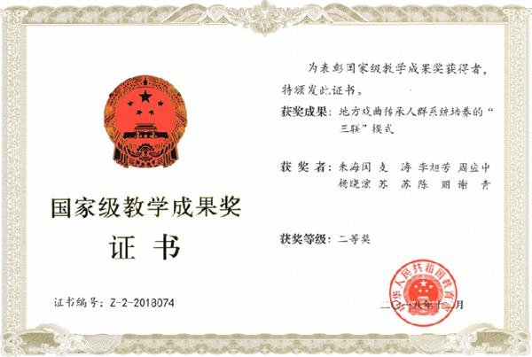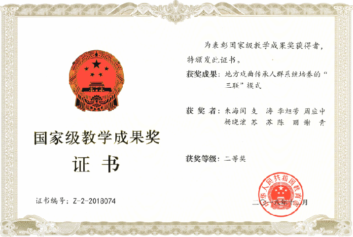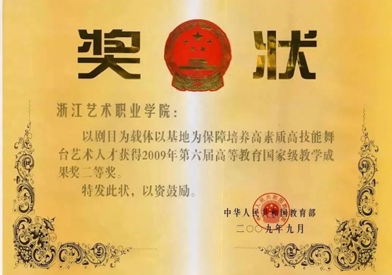 2009年,《以劇目為載體以基地為保障 培養(yǎng)高素質(zhì)高技能舞臺藝術(shù)人才》獲國家級教學(xué)成果二等獎。