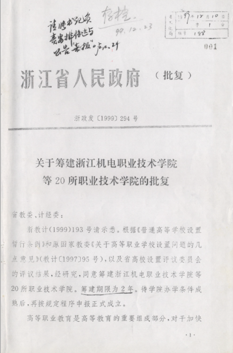 關(guān)于籌建立浙江機電職業(yè)技術(shù)學(xué)院等20所職業(yè)技術(shù)學(xué)院的批復(fù)