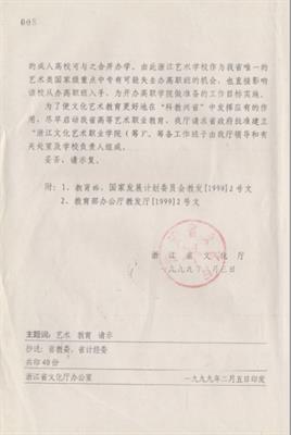 1999年12月6日,為適應(yīng)高等教育發(fā)展和文化大省建設(shè)需要,浙江省人民政府發(fā)文,批準同意浙江藝術(shù)學(xué)校、浙江省電影學(xué)校合并籌建浙江藝術(shù)職業(yè)學(xué)院,籌建期限兩年,是全國首家申辦藝術(shù)職業(yè)高等教育的藝術(shù)學(xué)校。籌建期間,浙江藝術(shù)學(xué)校本部稱黃龍洞校區(qū),浙江藝術(shù)學(xué)校分部稱留下校區(qū),浙江省電影學(xué)校稱馬塍路校區(qū)。