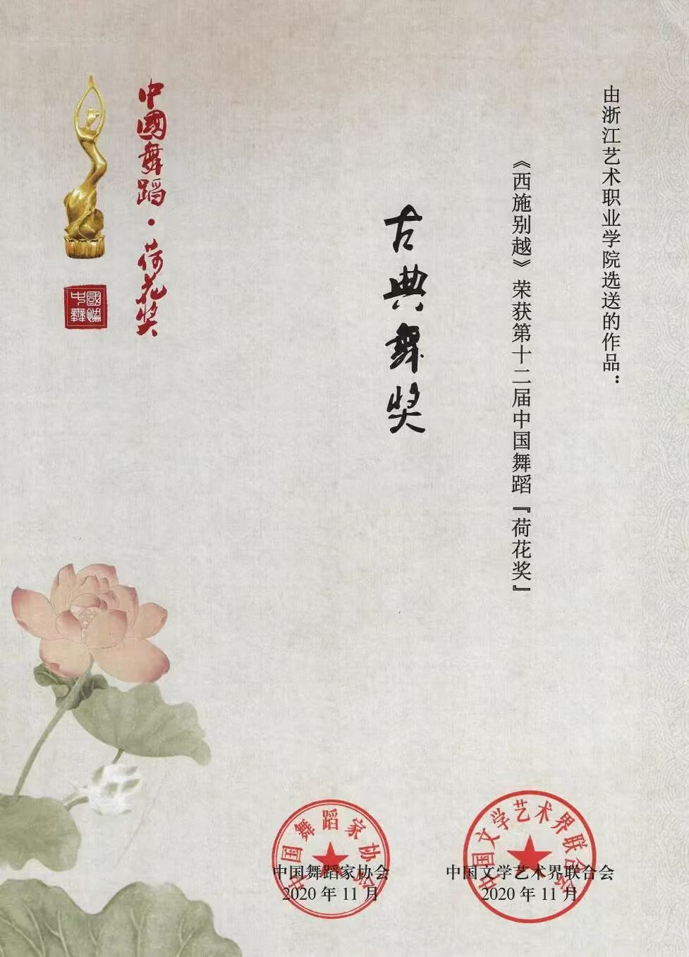 原創(chuàng)作品《西施別越》榮獲第十二屆中國舞蹈“荷花獎(jiǎng)”——古典舞獎(jiǎng)