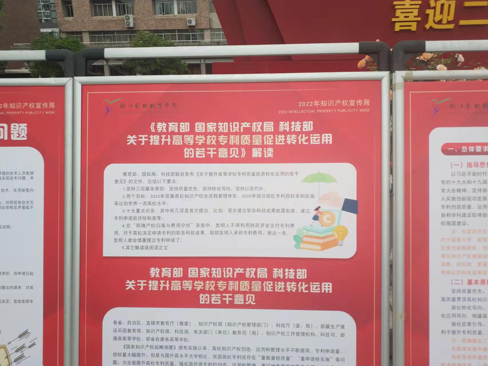 按照浙江省知識產(chǎn)權(quán)強(qiáng)省建設(shè)工作聯(lián)席會議辦公室《關(guān)于組織開展2022年知識產(chǎn)產(chǎn)權(quán)宣傳周活動的通知》要求,為全面提升知識產(chǎn)權(quán)保護(hù)意識,科研處精心選取了和老師們工作息息相關(guān)的專利申請等內(nèi)容,制作了《教育部 國家知識產(chǎn)權(quán)局 科技部關(guān)于提升高等學(xué)校專利質(zhì)量促進(jìn)轉(zhuǎn)化運(yùn)用的若干意見的解讀》以及《專利申請流程及有關(guān)問題》等十余塊宣傳展板,于4月10日—5月10日在學(xué)校中心廣場展出宣傳,從而加強(qiáng)專利全流程管理、促進(jìn)科技成果轉(zhuǎn)讓,為推動知識產(chǎn)權(quán)強(qiáng)國建設(shè)綱要實施、打造知識產(chǎn)權(quán)強(qiáng)國建設(shè)先行省添磚加瓦。