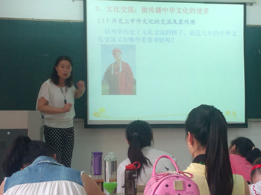 在10小音樂(lè)班,政治外聘老教師任文英講授了《世界文化的多樣性》。任老師以《樓蘭姑娘》為例,引入絲綢之路的案例來(lái)分析東西方文化的交流和融合,進(jìn)而擴(kuò)展到四大文明對(duì)世界的影響,從而帶出文化在交流中傳播的特性,又從文化傳播的含義、途徑和使者三個(gè)方面講授新課構(gòu)建本節(jié)課基本知識(shí)體系。任老師樂(lè)觀、陽(yáng)光的氣質(zhì),豐富的表情和肢體語(yǔ)言染了在場(chǎng)的每一位教師和同學(xué)。課后,綜合教研組對(duì)兩節(jié)示范課進(jìn)行了討論和點(diǎn)評(píng)和認(rèn)真總結(jié)。