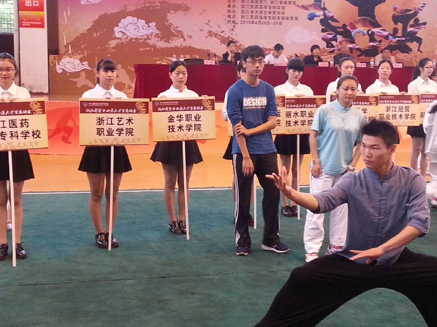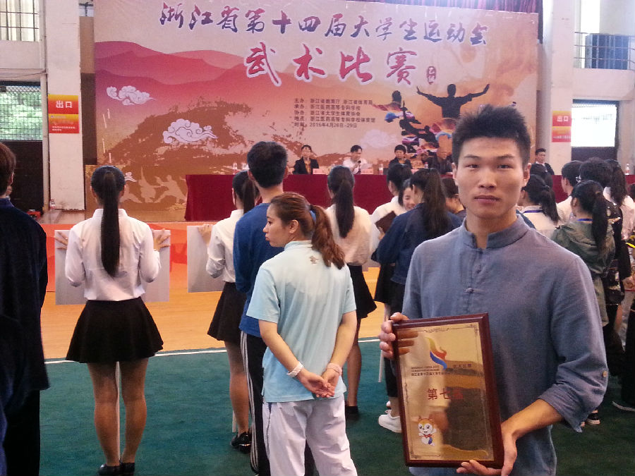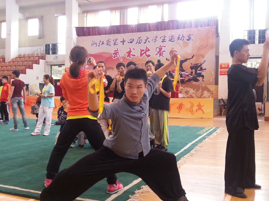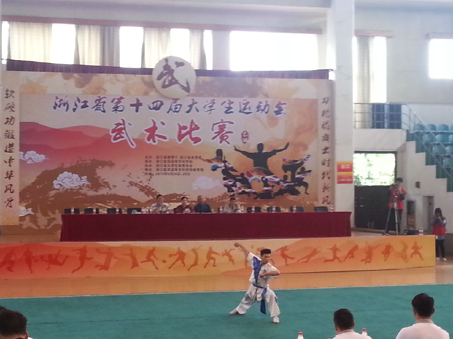 四年一屆的浙江省第十四屆大學(xué)生運(yùn)動(dòng)會(huì)武術(shù)比賽于2015年4月26-29日在浙江醫(yī)藥高等專科學(xué)校舉行,經(jīng)過層層選拔,我院選派了一位運(yùn)動(dòng)員參加了此次比賽,由黃文明老師擔(dān)任領(lǐng)隊(duì)、顧才銘老師擔(dān)任教練。本次比賽有來自全省17所高職院校、100多名大學(xué)生運(yùn)動(dòng)健兒參加武術(shù)套路比賽的激烈角逐。我院舞蹈系13編導(dǎo)班劉樂同學(xué)參加了男子長(zhǎng)拳和刀術(shù)兩個(gè)項(xiàng)目,經(jīng)過激勵(lì)的角逐,劉樂同學(xué)獲得了男子長(zhǎng)拳第二名、男子刀術(shù)第三名的好成績(jī),同時(shí)我院代表隊(duì)獲得了男子團(tuán)體第七名的好成績(jī),顧才銘老師獲得了“優(yōu)秀教練員”稱號(hào)、劉樂同學(xué)獲得“優(yōu)秀運(yùn)動(dòng)員”稱號(hào)。
