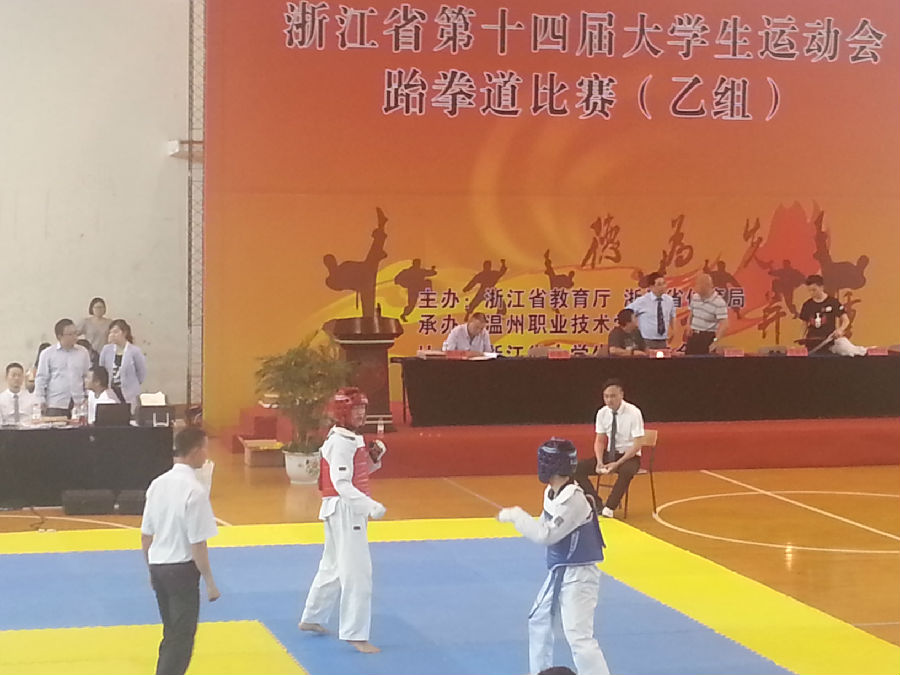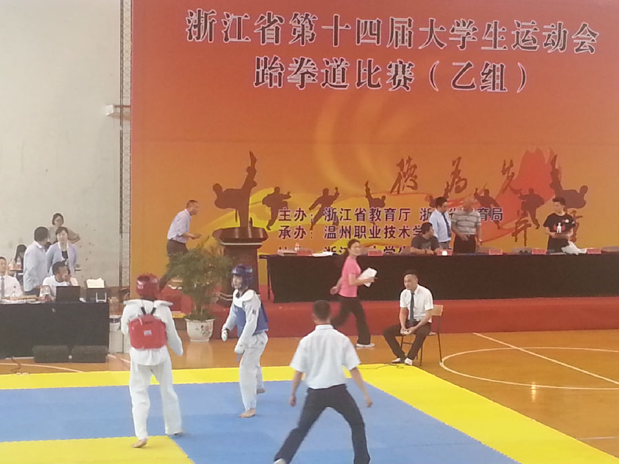 四年一屆的浙江省第十四屆大學(xué)生運(yùn)動會跆拳道比賽于2015年5月7-10日在溫州職業(yè)技術(shù)學(xué)院順利舉行,經(jīng)過長期的訓(xùn)練,我院代表隊(duì)選派了一位運(yùn)動員參加了此次比賽,由黃文明老師擔(dān)任領(lǐng)隊(duì)、顧才銘老師擔(dān)任教練。本次比賽有來自全省24所高職院校、300多名大學(xué)生運(yùn)動健兒參加跆拳道品勢和競技的激烈角逐。我院影視技術(shù)系12多媒體班陳燦同學(xué)參加了個人品勢和競技-58kg級別兩個比賽項(xiàng)目,經(jīng)過激勵的角逐,陳燦同學(xué)獲得了男子個人品勢第二名,競技第三名的好成績,我院代表隊(duì)還獲得了“體育道德風(fēng)尚獎”。