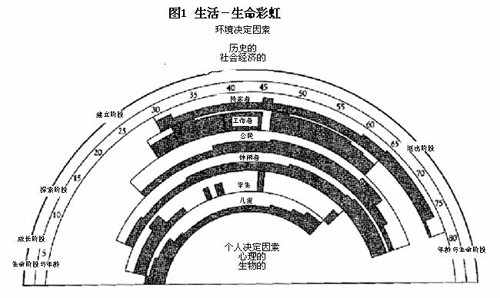 舒伯認(rèn)為一個人的職業(yè)生涯發(fā)展與在個人在發(fā)展歷程的各個階段中所扮演的各種角色如兒童、學(xué)生;休閑者、公民、工作者、夫妻、家長。父母和退休者。人在某一階段對某角色投入得多,會導(dǎo)致這一角色的成功,同時也可能導(dǎo)致另—角色的失敗。他稱發(fā)展的各個階段為生活廣度,稱個人扮演的角色為生活空間。生活廣度和生活空間交匯成為生涯彩虹圖.它描繪出了生涯發(fā)展階段與角色彼此間交互影響、多重角色生涯發(fā)展的狀況