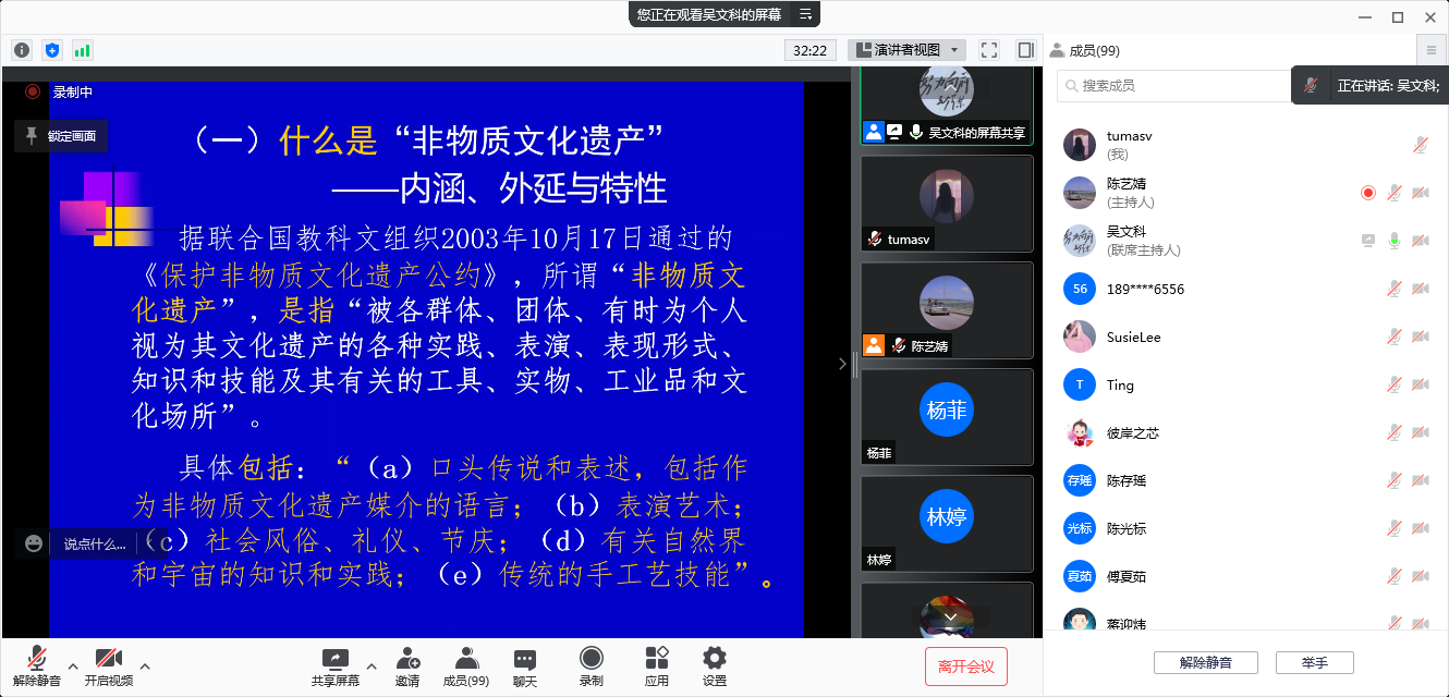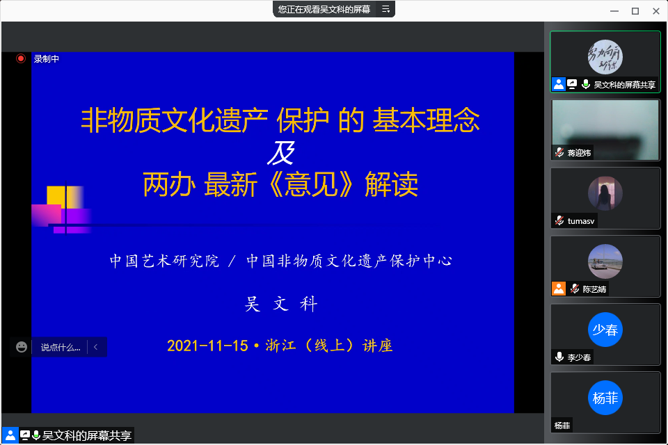 傳承歷史文化,是中華民族的精神標(biāo)識(shí),是我們國家的文化名片。本次培訓(xùn)聚焦非物質(zhì)文化遺產(chǎn)與文化創(chuàng)意融合發(fā)展的主題,具有很強(qiáng)的時(shí)代性、理論性與實(shí)踐性。培訓(xùn)班大咖云集,邀請(qǐng)了中國曲藝家協(xié)會(huì)副主席、中國藝術(shù)研究院曲藝研究所所長吳文科,清華大學(xué)美術(shù)學(xué)院教授陳岸瑛,文化和旅游部恭王府博物館學(xué)術(shù)委員會(huì)副主任、研究館員、國家非物質(zhì)文化遺產(chǎn)展覽展示研究中心執(zhí)行主任孫冬寧,中國美術(shù)學(xué)院手工藝博物館李計(jì)亮,浙江大學(xué)社會(huì)學(xué)系教授劉朝暉,浙江省非遺中心主任郭藝,杭州西泠文化創(chuàng)意有限公司董事長王恩清,字節(jié)跳動(dòng)政務(wù)總監(jiān)饒欣,浙江師范大學(xué)國際學(xué)院教授宣炳善等專家學(xué)者授課。培訓(xùn)課程圍繞非物質(zhì)文化遺產(chǎn)保護(hù)的理論與兩辦政策解讀,與傳統(tǒng)工藝傳承發(fā)展相關(guān)的兩個(gè)美學(xué)問題,第五屆中國非物質(zhì)文化遺產(chǎn)博覽會(huì)策展工作分享,民藝博物館展覽敘事,產(chǎn)業(yè)化、生態(tài)化與非遺保護(hù)的專屬權(quán)困境,新時(shí)代浙江省非物質(zhì)文化遺產(chǎn)傳承保護(hù)實(shí)踐,西泠文創(chuàng)——西泠印社非遺文化傳承與弘揚(yáng),短視頻助力非遺視覺化和分眾化傳播,非遺項(xiàng)目的品牌營造與鄉(xiāng)村旅游的文旅融合等多方面內(nèi)容展開教學(xué)。