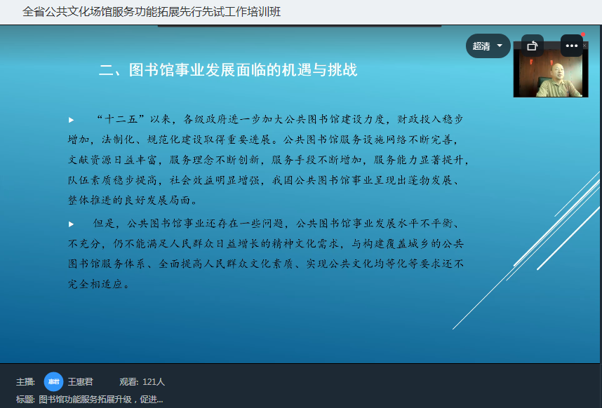 為切實發(fā)揮文旅公共服務(wù)優(yōu)質(zhì)、均等、共享的實效,提供高品質(zhì)的公共文化服務(wù)和便捷化旅游公共服務(wù),更好服務(wù)群眾,5月25日上午,由浙江省文化和旅游廳主辦、浙江藝術(shù)職業(yè)學(xué)院承辦的全省公共文化場館服務(wù)功能拓展先行先試工作培訓(xùn)班開班。本次培訓(xùn)班為期3天,采取線上直播形式舉辦,來自全省各市、縣(市、區(qū))文化和旅游局公共服務(wù)處(科)長、省文化和旅游廳公布的公共文化場館服務(wù)功能拓展先行先試單位負責(zé)人200余人參加培訓(xùn)。