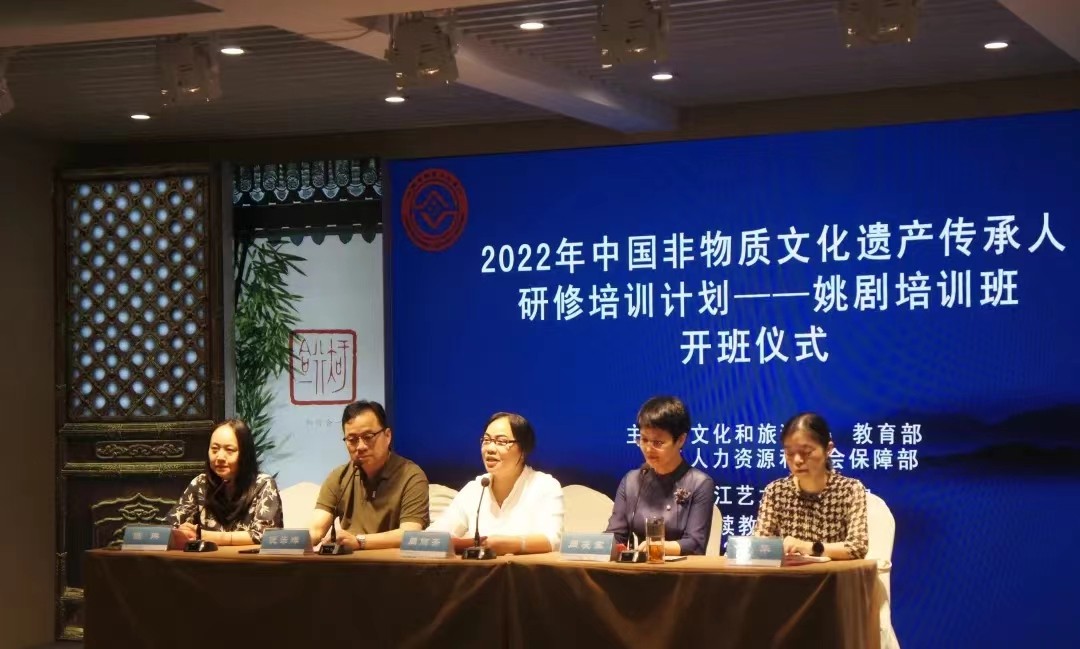 為弘揚(yáng)中華優(yōu)秀傳統(tǒng)文化,有效保護(hù)和傳承姚劇非物質(zhì)文化遺產(chǎn),促進(jìn)姚劇的國(guó)家級(jí)非遺保護(hù)傳承與發(fā)展,7月12日,由文化和旅游部、教育部、人力資源和社會(huì)保障部共同主辦,浙江藝術(shù)職業(yè)學(xué)院承辦的2022年中國(guó)非物質(zhì)文化遺產(chǎn)傳承人研修培訓(xùn)計(jì)劃——姚劇培訓(xùn)班順利開(kāi)班,來(lái)自余姚市姚劇保護(hù)傳承中心58位學(xué)員參加本次研修培訓(xùn)。浙江藝術(shù)職業(yè)學(xué)院繼續(xù)教育學(xué)院書(shū)記、院長(zhǎng)周麗芳,余姚市文廣旅體局副局長(zhǎng)周凌宏、余姚市文廣旅體局非遺科科長(zhǎng)劉華,余姚市姚劇保護(hù)傳承中心主任倪樂(lè)輝出席開(kāi)班儀式,儀式由浙江藝術(shù)職業(yè)學(xué)院繼續(xù)教育學(xué)院院長(zhǎng)助理陳琳主持。