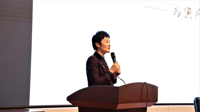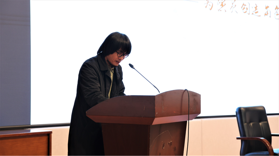 美術(shù)系常務(wù)副主任李昌國向師生們介紹藍玲設(shè)計的作品前后榮獲近百項國家級大獎,被戲劇界譽為“造美之人”,并代表美術(shù)系感謝藍玲對專業(yè)建設(shè)的大力支持。