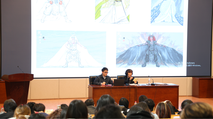 此次講座藍玲重點圍繞戲曲服裝設(shè)計的市場前景、設(shè)計人物服裝的過程和步驟以及服裝造型設(shè)計必須掌握的基本知識與技能展開,強調(diào)美術(shù)基礎(chǔ)、服裝結(jié)構(gòu)、服裝工藝、服裝材料、美學(xué)修養(yǎng)等對塑造舞臺人物服裝設(shè)計的重要性,并結(jié)合她設(shè)計戲劇服裝背后的故事,分享給師生們創(chuàng)作過程的經(jīng)驗和感悟。