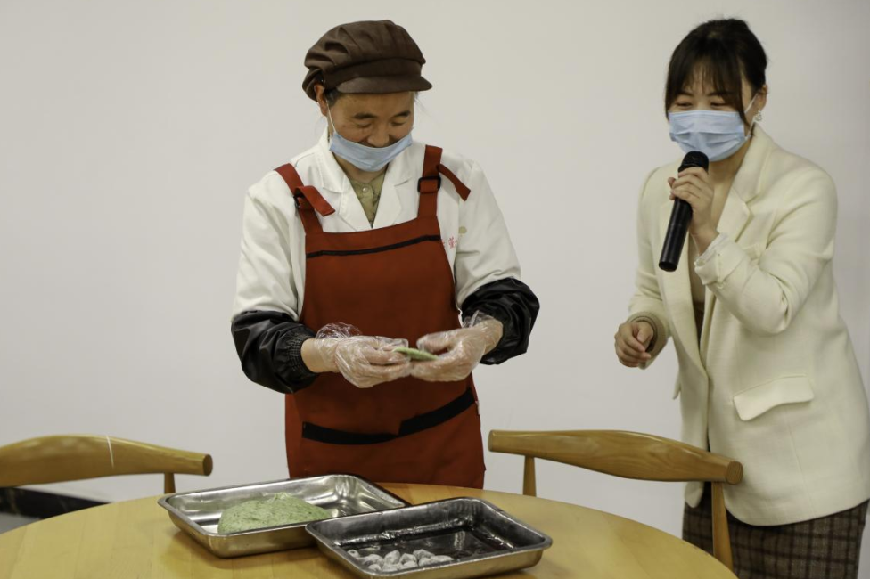 食堂師傅為大家詳細講解做青團的步驟,包括面團的揉搓方法、青團的包制手法和蒸制方式等。