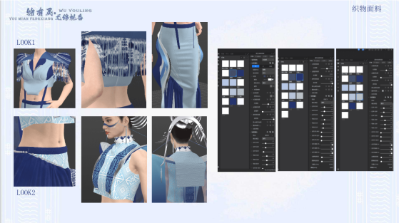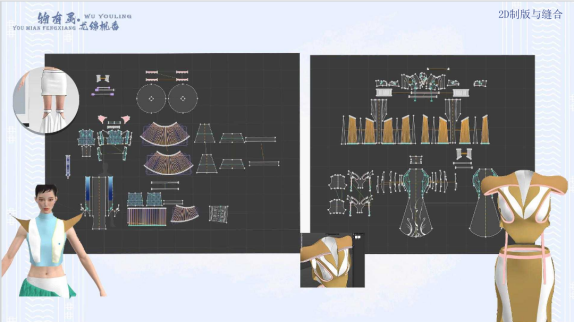 《物有靈——尤綿楓香》的靈感來源于瑤族傳統(tǒng)工藝中的蠟染,將瑤族服飾元素運用到現(xiàn)代禮服設計中的創(chuàng)作。在這次的融合設計中,選取瑤族的動物紋樣、幾何紋樣及圖騰崇拜紋樣進行提煉和重構,使用stlye3D2D制版技術以及3D虛擬仿真技術展現(xiàn)傳統(tǒng)工藝的藝術魅力,以時尚產(chǎn)業(yè)數(shù)字化推動民族服飾創(chuàng)新發(fā)展。