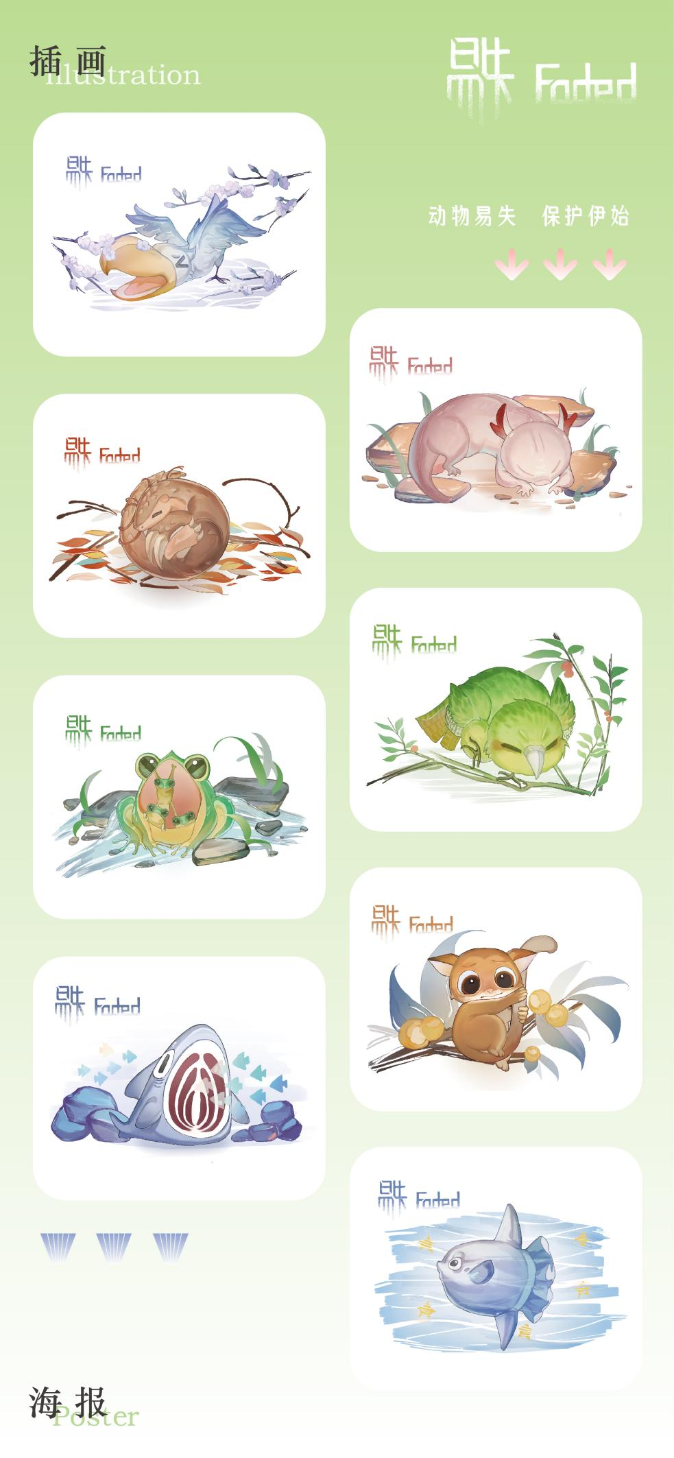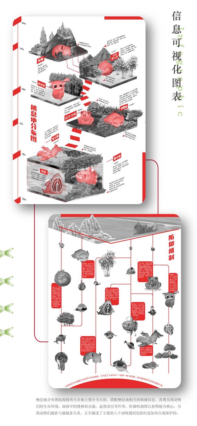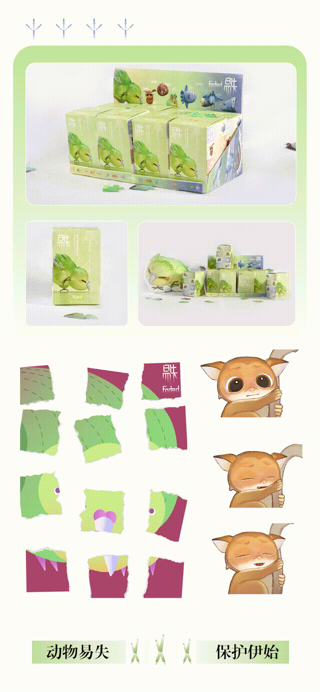 設(shè)計(jì)說(shuō)明:大自然創(chuàng)造了許多美麗可愛(ài)、富有靈氣的生命,但隨著社會(huì)的極速發(fā)展,大量的生靈由于自然災(zāi)害、人類經(jīng)濟(jì)活動(dòng)、棲息地的急劇變化、獵殺等原因?yàn)l臨滅絕,令人痛惜。本主題以瀕危動(dòng)物保護(hù)為切入點(diǎn),采用多元化的手法重塑瀕危動(dòng)物形象,通過(guò)文創(chuàng)設(shè)計(jì)的形式向大眾普及瀕危動(dòng)物知識(shí)。作品通過(guò)抽象幾何風(fēng)格的海報(bào)、卡通萌系插畫(huà)、動(dòng)物信息科普可視化圖表、live2D游戲互動(dòng)、3D角色盲盒等表現(xiàn)形式,將二維與三維多媒體技術(shù)結(jié)合,以豐富新穎的視覺(jué)表現(xiàn)形式來(lái)呼吁社會(huì)對(duì)該話題的關(guān)注。
