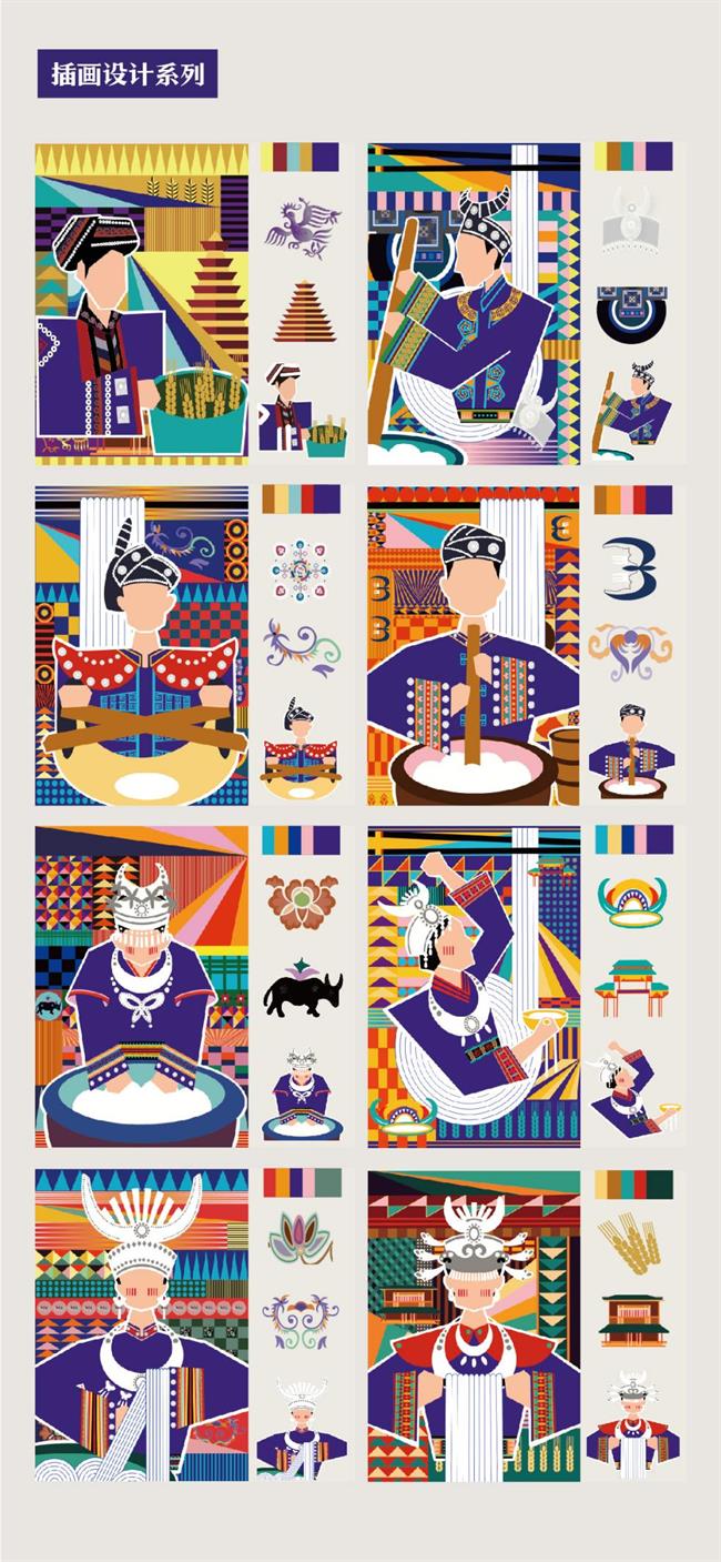 設(shè)計(jì)說(shuō)明:課題對(duì)貴州當(dāng)?shù)靥厣拙--“粉乎”米線品牌進(jìn)行整體形象系列打造和文創(chuàng)應(yīng)用,以非遺文化傳承與弘揚(yáng)為主線,將貴州特色手工米粉浸漬、蒸煮、壓榨等制作流程和工藝為主要元素,并結(jié)合當(dāng)?shù)亟ㄖ包c(diǎn)、服飾紋樣、民俗文化、傳統(tǒng)工藝等多方面背景,呈現(xiàn)多元性與多樣性的貴州文化特征。通過(guò)抽象的現(xiàn)代幾何風(fēng)格,不同文化元素組合再造,協(xié)助貴州米線“粉乎”品牌,并進(jìn)行一系列文創(chuàng)產(chǎn)品的開(kāi)發(fā)與應(yīng)用,助力貴州特色米線產(chǎn)品的市場(chǎng)拓展發(fā)展。