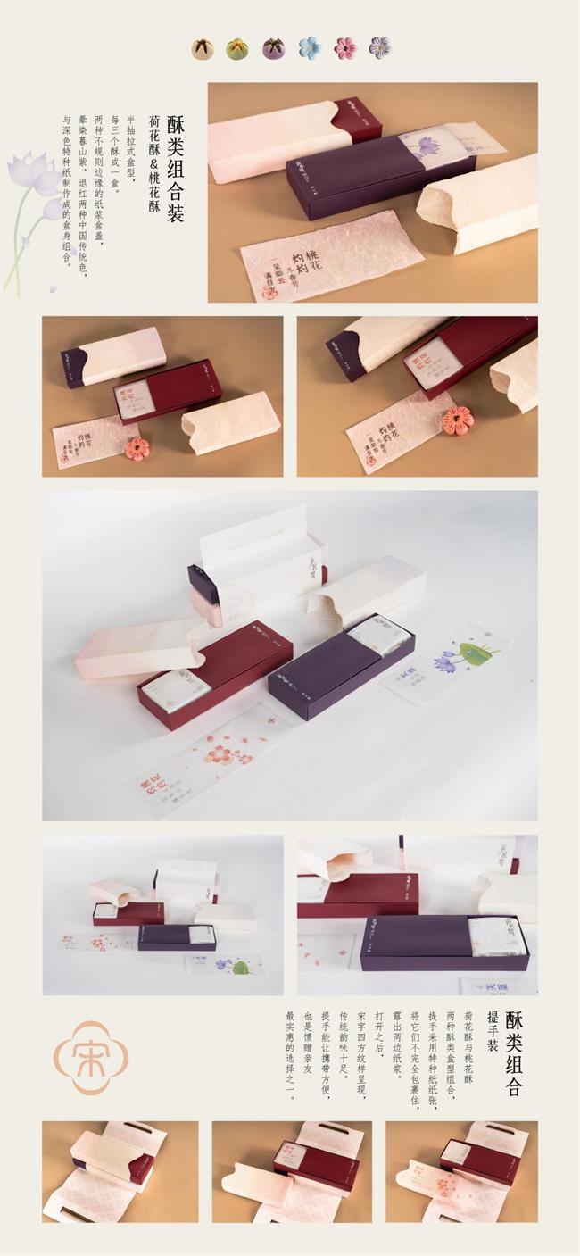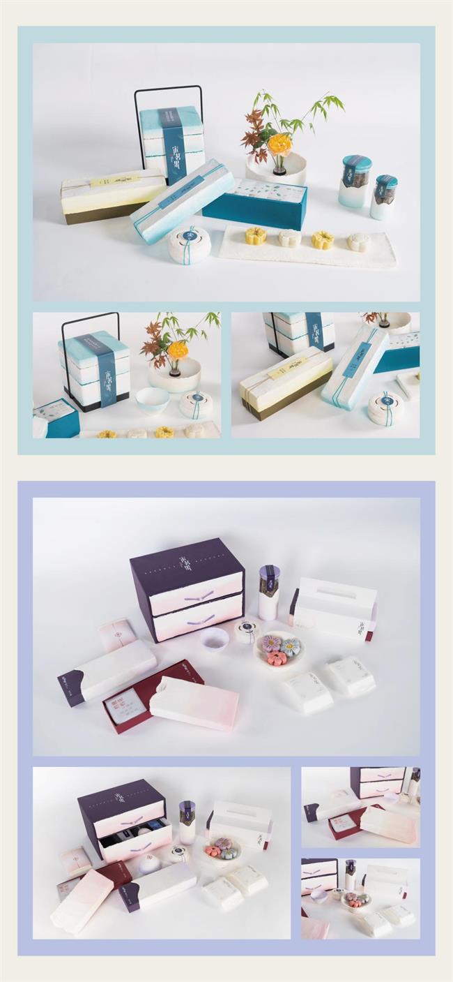 設(shè)計(jì)說(shuō)明:本課題項(xiàng)目以宋韻文化為背景,打造了一個(gè)中式茶點(diǎn)自創(chuàng)品牌——“宋茗果”。在包裝材料上選擇可塑性較強(qiáng)且環(huán)保的紙漿,運(yùn)用紙漿塑型工藝制作包裝容器,提高了保護(hù)性和可重復(fù)使用性。紙漿有明顯的肌理感,搭配一系列從宋代五大窯中提取的色彩,如“暮山紫”、“西子”等,使包裝有古樸素雅的質(zhì)感。包裝主要盒型有四種:天地蓋和抽拉式的中包裝,以食盒為原型的小禮盒裝和抽屜式的大禮盒裝。此外根據(jù)宋代四藝,還制作了建盞、焚香盒、花瓶等衍生品,使人們感受到宋代獨(dú)具韻味的生活美學(xué)。