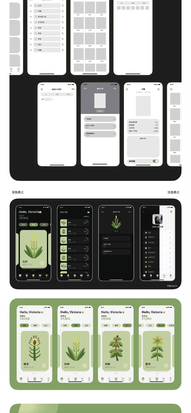 設(shè)計(jì)說(shuō)明:在大量同質(zhì)化產(chǎn)品競(jìng)爭(zhēng)造成產(chǎn)能過(guò)剩的問(wèn)題下,移動(dòng)界面設(shè)計(jì)將成為應(yīng)用軟件的突破口。故扁平化風(fēng)格因其直觀、悅目且操作方便的設(shè)計(jì)風(fēng)格,滿足了現(xiàn)代快節(jié)奏趨勢(shì)下大眾的內(nèi)在心理需求,而引領(lǐng)了一場(chǎng)視覺(jué)藝術(shù)的革命,但快節(jié)奏生活也是引起許多人亞健康狀態(tài)的原因之一。植物為人類提供絕無(wú)僅有的生命之撐和生態(tài)保護(hù),是舒緩、療愈、溫和、健康的代名詞。所以本課題意在以植物為切入點(diǎn)實(shí)現(xiàn)一款健康生活方式打卡移動(dòng)應(yīng)用的UI界面,整體設(shè)計(jì)以植物生長(zhǎng)過(guò)程為大背景,用戶對(duì)自己理想健康生活習(xí)慣的養(yǎng)成為成長(zhǎng)過(guò)程,植物生長(zhǎng)的每一個(gè)階段都與用戶對(duì)自身習(xí)慣的養(yǎng)成息息相關(guān),每一個(gè)關(guān)于健康的小進(jìn)步都會(huì)體現(xiàn)在植物的生長(zhǎng)進(jìn)程上。