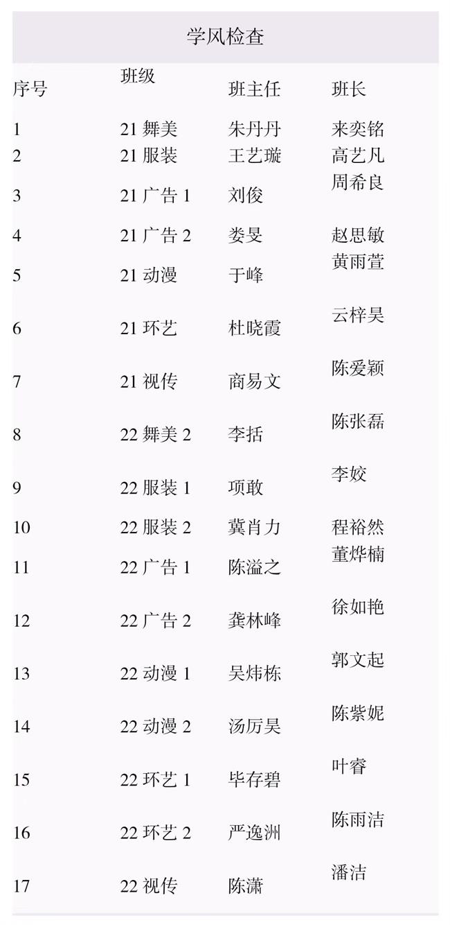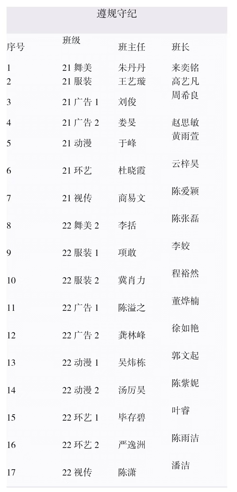 經(jīng)過檢查評(píng)比,本期推送4月、5月在課堂考勤、學(xué)風(fēng)檢查、公寓考勤、違規(guī)違紀(jì)檢查中表現(xiàn)優(yōu)異的班級(jí),分別是: