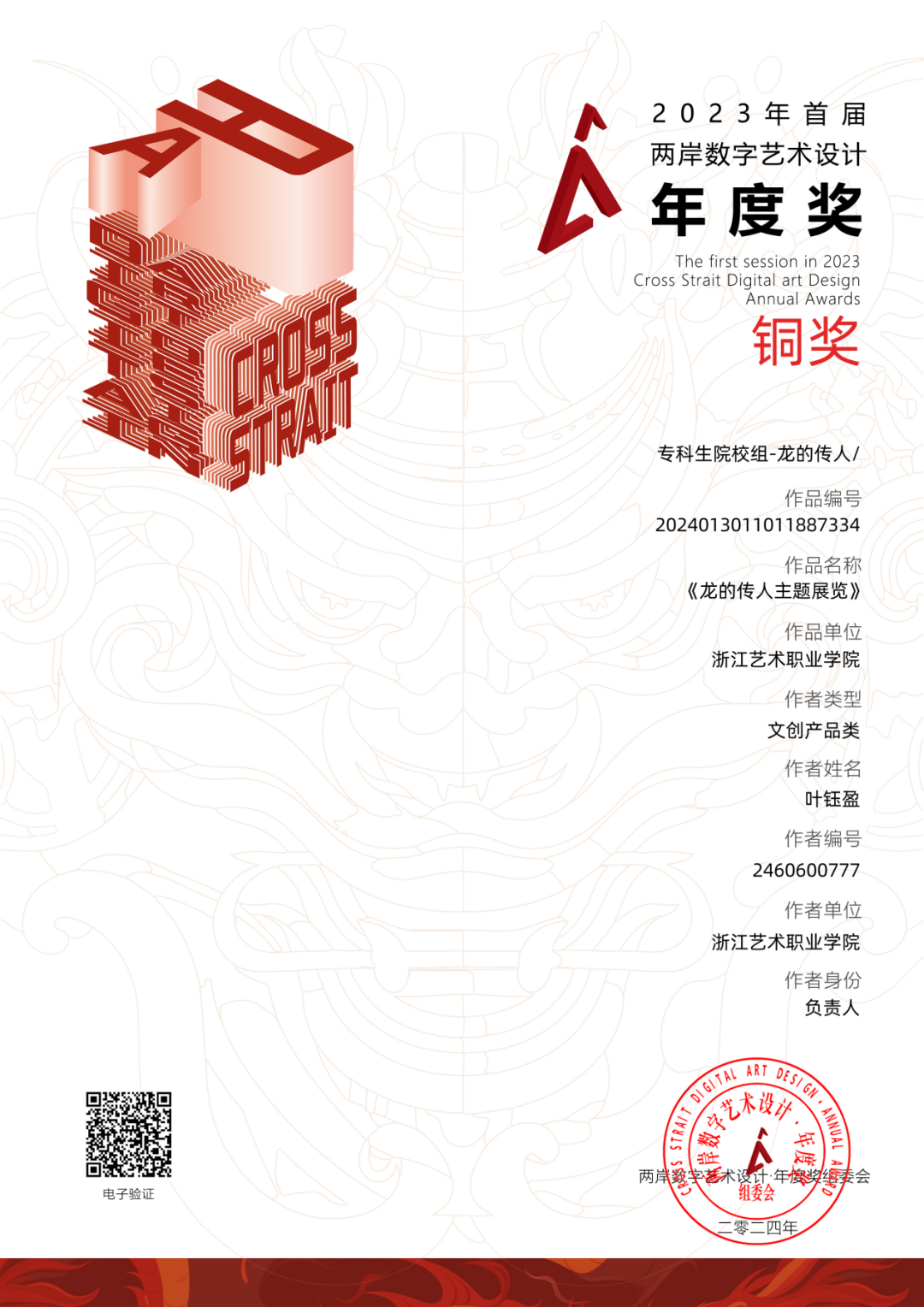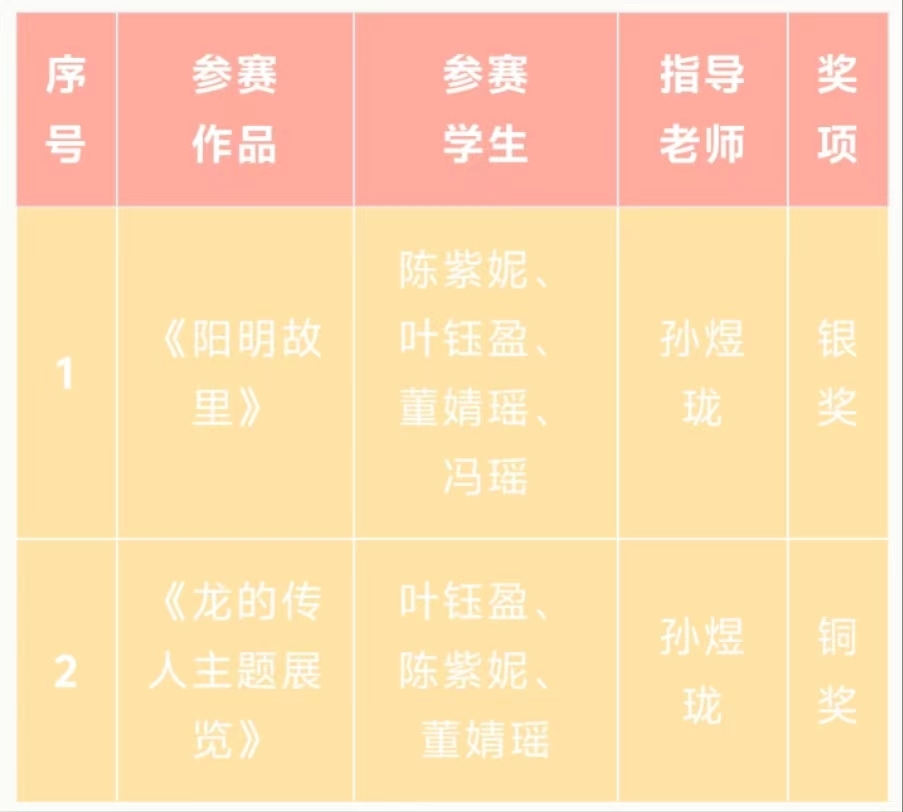 近日,由海峽兩岸交流促進(jìn)會、臺灣旅游和文化協(xié)會牽頭,臺灣國際文化創(chuàng)意產(chǎn)業(yè)發(fā)展協(xié)會、高教創(chuàng)賽云競賽服務(wù)平臺及兩岸文創(chuàng)單位和多所大學(xué)協(xié)辦的2023首屆兩岸數(shù)字藝術(shù)設(shè)計·年度獎獲獎結(jié)果公布。本屆賽事共征集到來自全國各地的命題賽道“龍的傳人”及非命題賽道共計41531項參賽作品,參賽總?cè)藬?shù)達(dá)8.7萬人,參賽院校及單位共1521所。設(shè)計學(xué)院動漫設(shè)計專業(yè)專業(yè)帶頭人孫煜瓏所指導(dǎo)的2022級動漫設(shè)計專業(yè)陳紫妮、葉鈺盈、董婧瑤、馮瑤同學(xué)的作品《陽明故里》榮獲該賽項銀獎,葉鈺盈、陳紫妮、董婧瑤同學(xué)的作品《龍的傳人主題展覽》榮獲該賽項銅獎。