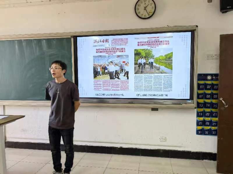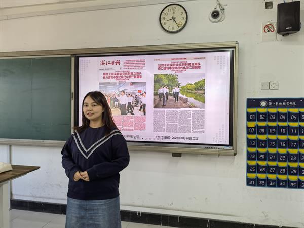 在老師的帶領(lǐng)下,同學(xué)們共同閱讀《浙江日報》2023年9月26日刊登的《始終干在實(shí)處走在前列勇立潮頭 奮力譜寫中國式現(xiàn)代化浙江新篇章》等報道,思政老師們也結(jié)合授課內(nèi)容,對黨報內(nèi)容進(jìn)行了深入淺出的解讀,讓學(xué)生們在熟悉又特別的情景和方式中熟悉黨報、走進(jìn)黨報,引導(dǎo)學(xué)生進(jìn)一步領(lǐng)會習(xí)近平新時代中國特色社會主義思想的世界觀和方法論。
