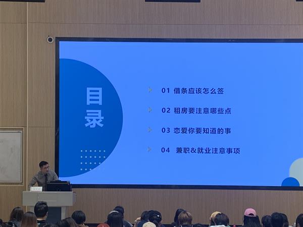 金文超律師以“大學(xué)生實用法律問題”為主題,以大學(xué)生身邊鮮活生動的案件進(jìn)一步引導(dǎo)同學(xué)們樹立規(guī)則意識、法律意識,分別以“借條應(yīng)該怎么寫”“租房要注意哪些點”“戀愛你要知道的事”“兼職就業(yè)注意事項”四個方面以案說法,兼具學(xué)理性和故事性,給同學(xué)們清晰地界定“什么可以做、什么不能做”,明確自身行為界限,從而起到預(yù)防違法犯罪、減少矛盾糾紛的效果。