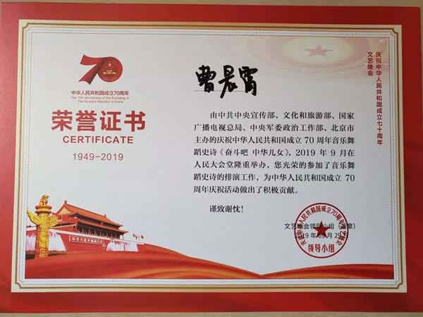 國(guó)慶前夕,慶祝中華人民共和國(guó)成立70周年大型文藝晚會(huì)《奮斗吧 中華兒女》在北京舉行。習(xí)近平、李克強(qiáng)、栗戰(zhàn)書(shū)、汪洋、王滬寧、趙樂(lè)際、韓正、王岐山等黨和國(guó)家領(lǐng)導(dǎo)人,同4000多名觀眾一起觀看演出,共同回顧新中國(guó)成立70年來(lái)的輝煌歷程,共同祝福偉大祖國(guó)的美好前程。我校舞蹈系兩位教師曹晨霄、譚雨旋參與了此次盛大演出的編導(dǎo)。