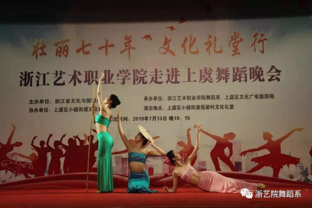 為慶祝新中國(guó)成立70周年,中國(guó)共產(chǎn)黨成立98周年,積極響應(yīng)省文化和旅游廳關(guān)于農(nóng)村文化禮堂建設(shè)要求,7月11日至7月13日,舞蹈系走進(jìn)上虞區(qū)道墟街道錢上村、嵊州市三江街道上東潭村、上虞區(qū)小越街道倪梁村,為家鄉(xiāng)父老送上系里精心準(zhǔn)備的舞蹈專場(chǎng)文藝演出。場(chǎng)內(nèi)座無(wú)虛席,臺(tái)上燈光閃爍,亦古典悠揚(yáng)亦青春靚麗,亦田園風(fēng)格亦童真童趣的一幕幕舞蹈引發(fā)觀眾陣陣掌聲。