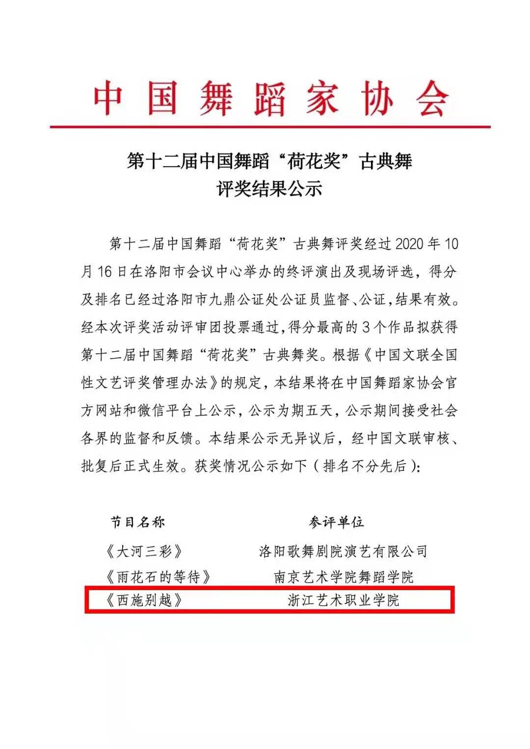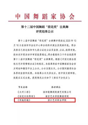 中國(guó)舞蹈家協(xié)會(huì)官方網(wǎng)站和微信平臺(tái)今天公示,經(jīng)過(guò)10月16日第十二屆中國(guó)舞蹈“荷花獎(jiǎng)”古典舞評(píng)獎(jiǎng)終評(píng)演出及現(xiàn)場(chǎng)評(píng)選,得分最高的3個(gè)作品擬獲得第十二屆中國(guó)舞蹈“荷花獎(jiǎng)”古典舞獎(jiǎng)。我校舞蹈作品《西施別越》位列前三甲,正在公示名單中。據(jù)悉,此次“荷花獎(jiǎng)”古典舞評(píng)獎(jiǎng)競(jìng)爭(zhēng)激烈,全國(guó)共有174部作品報(bào)名參評(píng),只有16部作品入圍現(xiàn)場(chǎng)終評(píng)演出,最終只產(chǎn)生3個(gè)“古典舞獎(jiǎng)”。