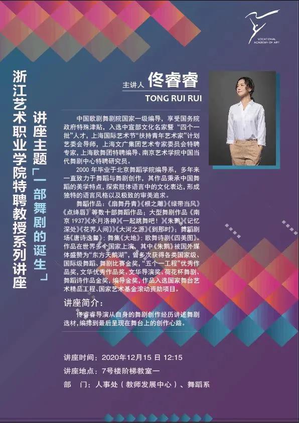 12月15日,我校特聘教授、中國歌劇舞劇院國家一級編導(dǎo)佟睿睿來校座談交流并開設(shè)講座,為師生們分享了當今舞蹈創(chuàng)作最前沿的理念和思路。舞蹈系領(lǐng)導(dǎo)班子、教研室主任、教師和學生們一起參加活動。