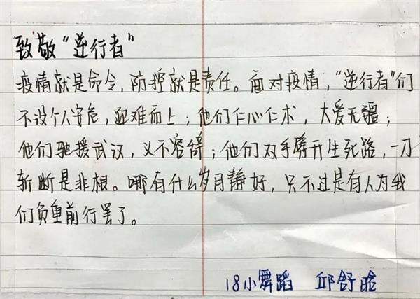 在全國疫情防控進入常態(tài)化之時,我系大中專學(xué)生也順利返校復(fù)學(xué),浙藝舞蹈系同心協(xié)力,在系領(lǐng)導(dǎo)班子倡議統(tǒng)籌下,黨員教工們特別推出了自制創(chuàng)意“加油”視頻,致敬這個時代最可愛的人。在系黨總支部署下,延續(xù)“書寫新時代”系列活動,開展“青春有我,以藝戰(zhàn)疫”的文藝創(chuàng)作活動,同學(xué)們通過錄制視頻、寫文章、創(chuàng)作書畫作品來歌頌大愛,禮贊勇士,發(fā)揚抗疫精神。雖然同學(xué)們疫情期間身處各地,但心在一起,作為浙藝人,我們愿用自己的力量為抗擊疫情助力。現(xiàn)將部分學(xué)生書畫作品進行展示。