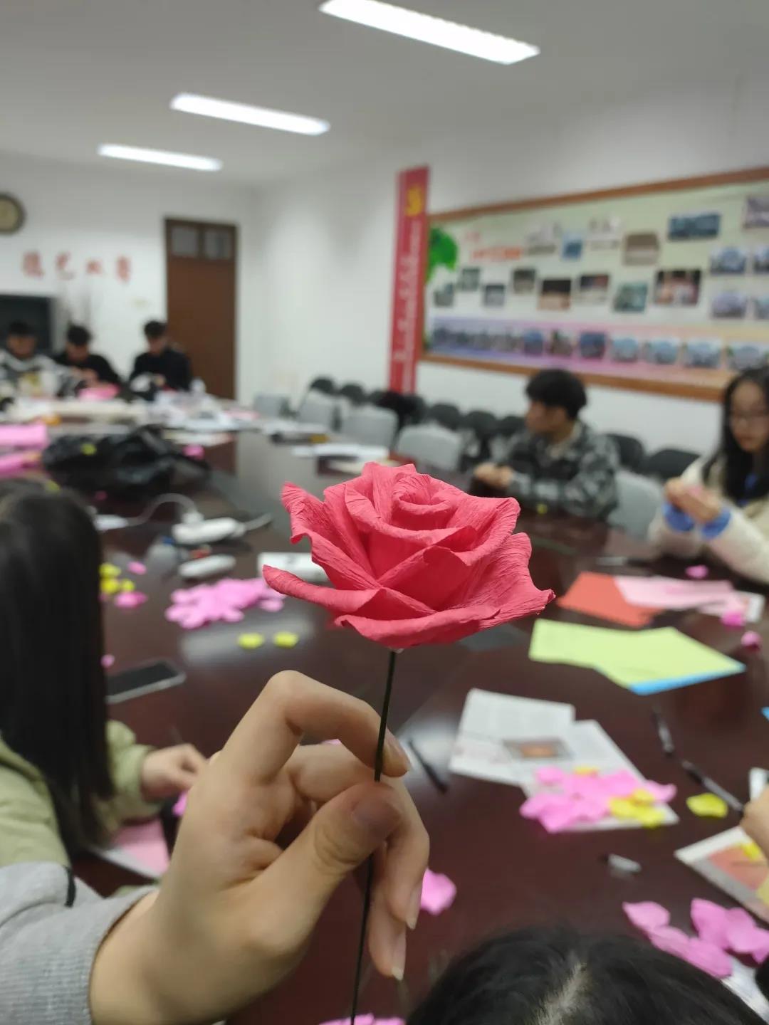 學生會的同學們在前一天準備好了手工制作材料,分工明確,男生女生一起,有的剪“花枝”,有的剪“花瓣”,有的把“花瓣”們粘成“花朵”,有的把做好的“花”包裝好。心靈手巧的他們從零學起,僅用一整天的時間就做出了300朵手工花。