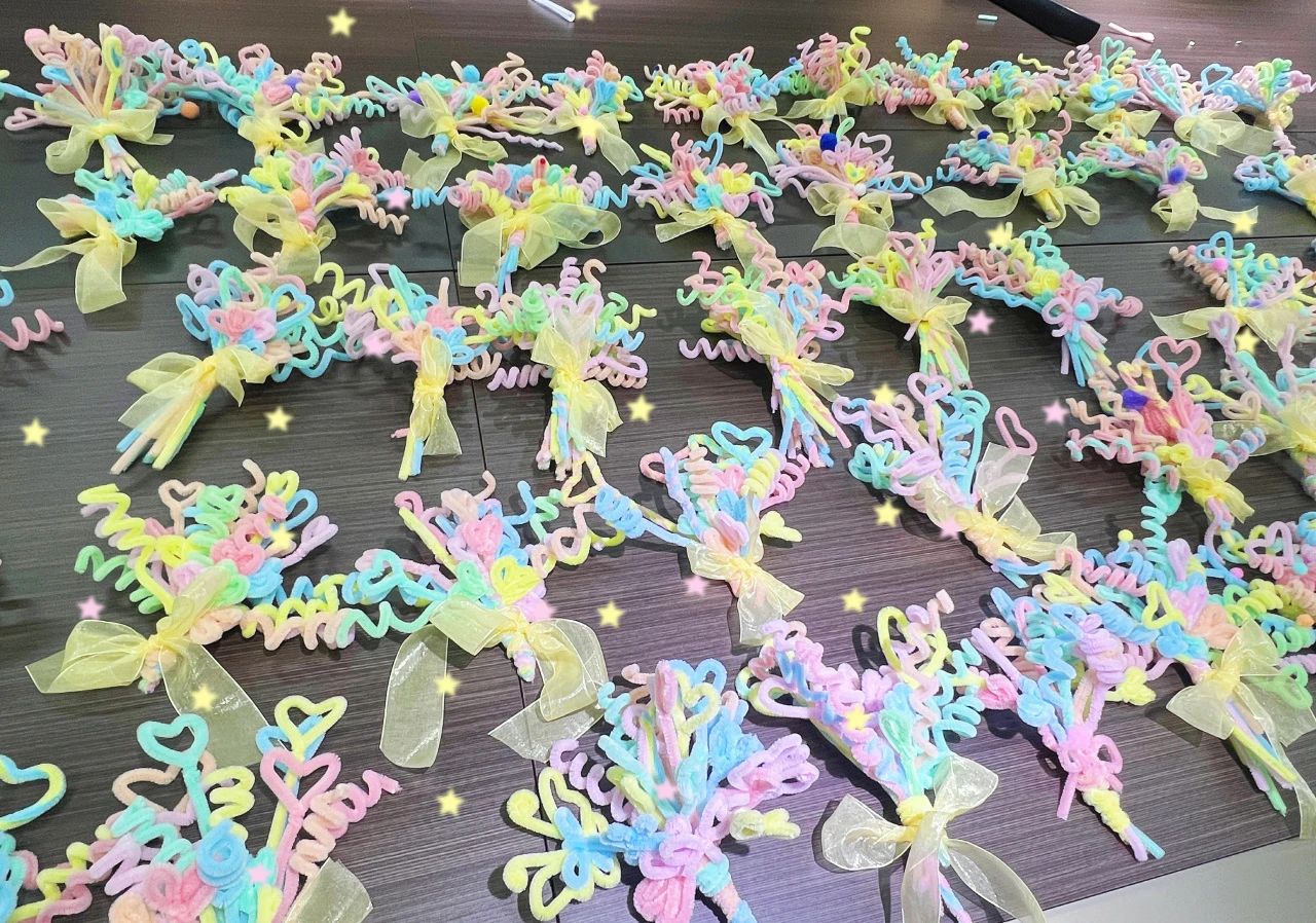 課余時間的教室變身創(chuàng)意工坊,同學(xué)們圍坐成圈,對著教程反復(fù)練習(xí)扭、折、繞的技巧。有人將粉色扭棒卷成含羞的愛心,有人把金絲擰作向日葵的燦爛,更有巧手的同學(xué)為花束系上絲帶,附上手寫卡片。