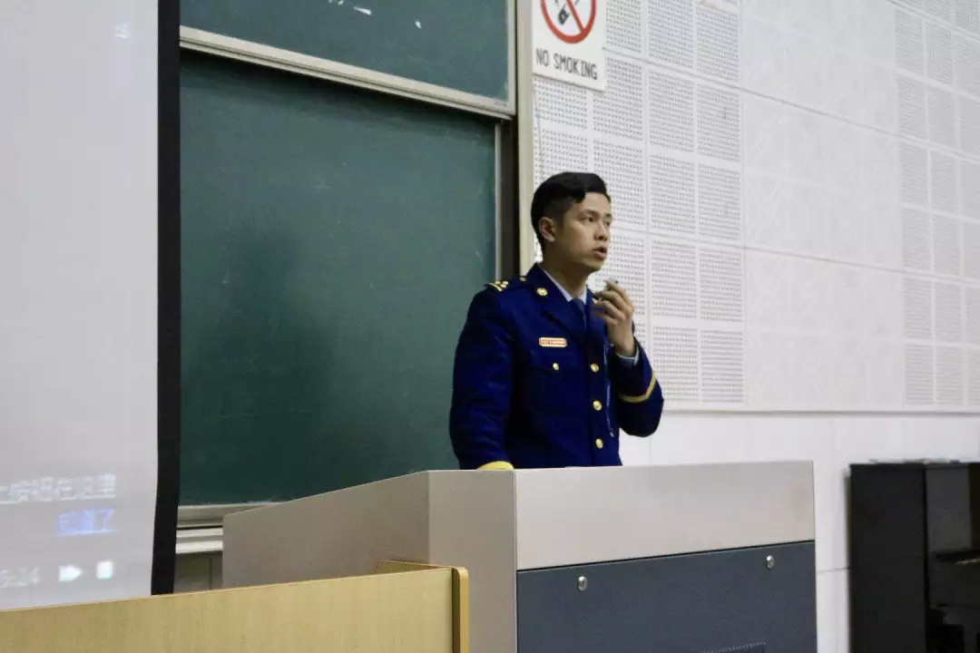 章一立以濱江高教園區(qū)周邊真實火災(zāi)視頻案例開場,通過現(xiàn)場危險狀況的描述,當(dāng)事人的恐懼心理切入消防安全知識主題,以慘痛的火災(zāi)事故引起同學(xué)們對消防安全的重視。他通過一個個真實的視頻案例講述了火災(zāi)蔓延速度之快、濃煙對呼吸道損害之強、火災(zāi)時氣流對皮膚的傷害之深,還沉痛地回憶了幾位消防員戰(zhàn)友因火災(zāi)而獻身的事跡,并對視頻中的英雄們敬禮,全場認(rèn)真肅穆。