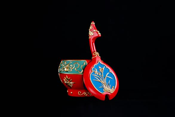 泥金彩漆16件:雙龍長(zhǎng)提桶、討奶桶、軟摜提桶、圓和盒、馬桶、八角果子桶2個(gè)、茶葉罐2個(gè)、鎮(zhèn)紙(一對(duì))、扇面(5把);嚴(yán)海斌的朱金漆木雕作品《福星高照》4幅、童獻(xiàn)松的朱金漆木雕龍舟一艘。