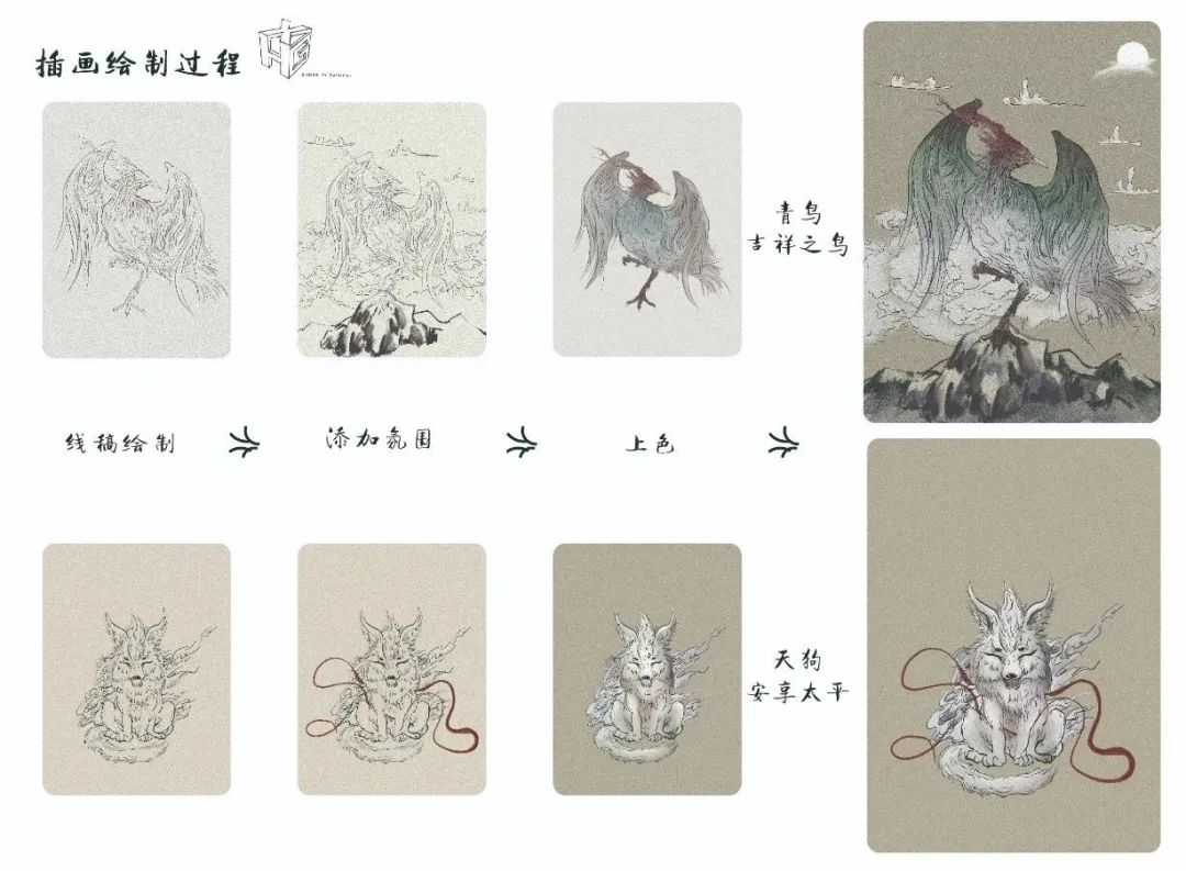 制作思路: 遂古之初,誰傅道之。上下四方,宇宙洪荒。天地鴻蒙,大道未央。 《山海經(jīng)》中華文化的瑰寶,中華神話的源頭,里面的奇珍異獸,真的存在嗎?作者又是誰?…… 這本書深深的抓住了我們的好奇心,我組便以《山海經(jīng)》為文創(chuàng)背景,制作一系列文創(chuàng)品,打造屬于我們自己的神話世界。 我們從風(fēng)格選擇、呈現(xiàn)手法、觀展人群、制作工藝多方面的考量下,決定放棄了傳統(tǒng)手繪,以圖案設(shè)計為主,再對產(chǎn)品進(jìn)行附加。并選擇了以下三只出自山海經(jīng)的奇珍異獸進(jìn)行藝術(shù)創(chuàng)造。分別是:青鳥、天狗、燭龍。
