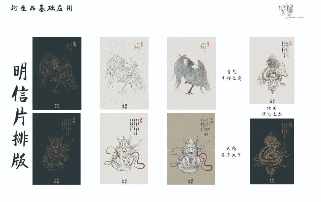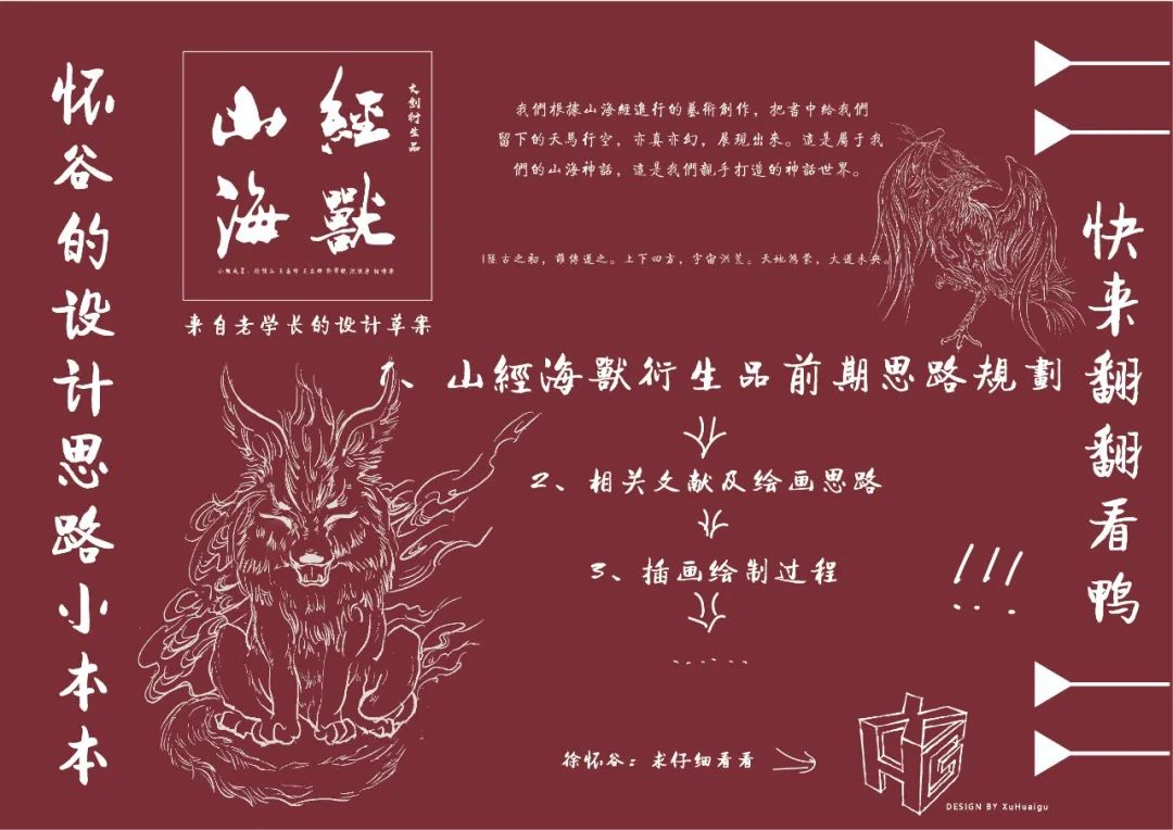 Related literatur& painting ideas 李商隱的愛情詩中這樣寫道:“蓬山此去無多路,青鳥殷勤為探看。”可見這時的青鳥已經(jīng)有了愛情的寓意,當(dāng)時的形象多為小鳥。 但我們翻閱古籍,不難發(fā)現(xiàn),其實青鳥是鳳凰的前身,是猛禽,且赤頭,目黑,居于蓬萊之地。我們就以這樣的形象進(jìn)行繪制。 ● ● 天狗 的相關(guān)文獻(xiàn)及個人繪畫思路 Related literatur& painting ideas 天狗其實很容易被人混淆,歷史上的天狗大致有三只,一只是原山海經(jīng)的,一只是食日的,一只是日本的天狗。山海經(jīng)的天狗,可與后來食日的天狗截然不同。 一是寓意不同,二描述的樣貌也不同,山海經(jīng)里的天狗,雖曰是天狗,但真正考證起來可能是像貍貓的樣子。 《山海經(jīng)·西山經(jīng)》記載,在華山西很遠(yuǎn)的地方,“有獸焉,其狀如貍而白首,名曰天狗,其音如榴榴,可以御兇。“從叫聲和狀如貍都不難看出,并且還是一只御兇的瑞獸。我們同樣依書創(chuàng)作。 燭龍 的相關(guān)文獻(xiàn)及個人繪畫思路 Related literatur& painting ideas 燭龍頗有神話色彩,它是中國古代神話中的鐘山山神,身長千里,通體赤紅,居住于章尾山。 《山海經(jīng)》是這樣描述燭龍的:“西北海之外,赤水之北,有章尾山。有神,人面蛇身而赤,直目正乘。其瞑乃晦,其視乃明。不食,不寢,不息,風(fēng)雨是謁。是燭九陰,是謂燭龍……鐘山之神,名曰燭陰,視為晝,瞑為夜,吹為冬,呼為夏,不飲,不食,不息,息為風(fēng),身長千里。在無綮之東。其為物,人面,蛇身,赤色,居鐘山下。 不管是名字還是書中的描述,我的腦海里一條威武的龍已經(jīng)馬上的浮現(xiàn)在我的腦中。我們抓住特征人面,蛇身,赤色并進(jìn)行繪制。 結(jié)束了圖形的創(chuàng)作,我們便考慮產(chǎn)品應(yīng)用的問題,規(guī)劃了很多,綜合了成本、效果出售率和節(jié)日因素,我們把目標(biāo)放在新年壓歲包上。并把圖案融入手稿、海報,宣傳報等各處應(yīng)用。 ● ● ● ● 排 版 & 設(shè) 計 應(yīng) 用 Typesetting design 【壹】 擬訂的產(chǎn)品和海報設(shè)計 【貳】 制作思路排版設(shè)計 【叁】 畢業(yè)展攤位布置及背景墻設(shè)計 【肆】