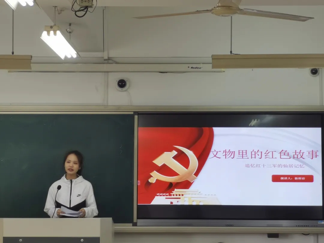 20定向1班楊雨潔通過(guò)“追憶紅十三軍的仙居印記”為主題,帶我們走進(jìn)故事的主人公“紅一團(tuán)”仙居游擊隊(duì)隊(duì)長(zhǎng)——金永洪。“共產(chǎn)黨人是殺不盡的!”他這聲在殉難時(shí)向敵人的怒吼,再次將“不怕死的神槍隊(duì)”的革命精神展現(xiàn)在我們面前。她指出,為了在將來(lái)成為一名更好的鄉(xiāng)鎮(zhèn)文化員,應(yīng)致力于將文物中的紅色黨史故事,通過(guò)各種形式讓大眾去認(rèn)識(shí),去了解。