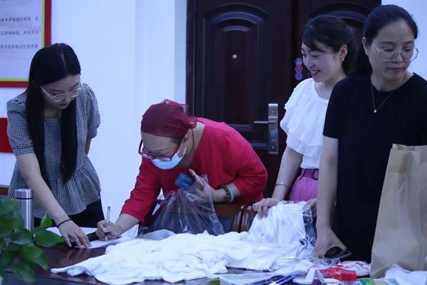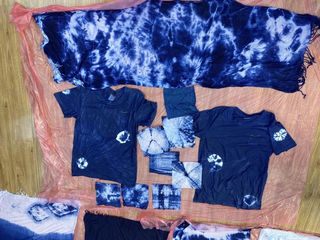 大致二十分鐘后將布料拿出,一件件獨(dú)一無二的作品孕育而生,大家在學(xué)習(xí)體驗(yàn)傳統(tǒng)扎染文化的同時(shí),收獲一份精美的藝術(shù)作品,也收獲了整個(gè)創(chuàng)意制作過程中的喜悅與成就感。扎染還結(jié)合了建黨百年主題元素特別制作了系列包含黨徽的漸變扎染作品。