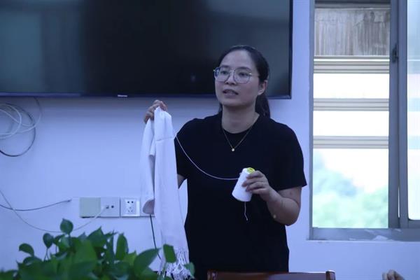 活動(dòng)中,民族傳統(tǒng)技藝專業(yè)教師胡錦霞從扎染的歷史開始講述,生動(dòng)有趣地講述了“學(xué)習(xí)扎染的目的、扎染的特點(diǎn)以及扎染的扎法和染法”等主要內(nèi)容,示范了“困扎法、打結(jié)扎法、任意褶皺扎法、折疊扎法”等多種扎法。