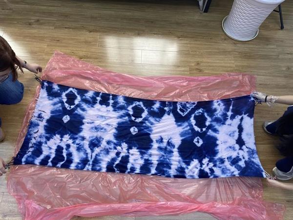 在胡老師的指導(dǎo)下,體驗(yàn)者們將天然質(zhì)地的布料用橡皮筋進(jìn)行捆扎、折疊、扭曲、夾、壓等方式在布的表面創(chuàng)造出漂亮的視覺設(shè)計(jì),然后把捆扎好的布料浸透到調(diào)配好的靛藍(lán)染液桶里,輕柔地用染液滲透布料,同時(shí)搖勻桶里的染液。