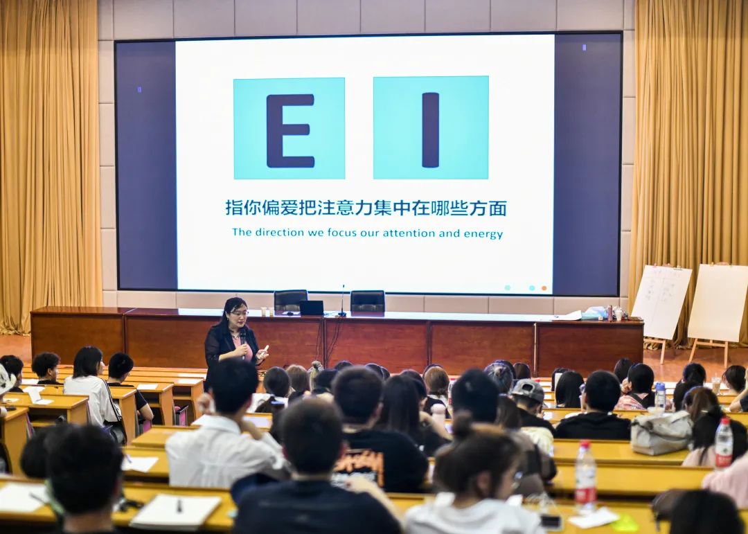 一是運(yùn)用榮格的“性格類型”探索自己的天性。張靜首先拋出“天生性格是什么”的問題與同學(xué)們進(jìn)行互動(dòng),讓同學(xué)們?cè)诩埳戏謩e用左右手寫下自己的名字,從而讓同學(xué)體會(huì)到天生性格就像是用手習(xí)慣。老師與同學(xué)們圍繞四種偏好:精力、感知、生活方式、判斷,進(jìn)行了趣味互動(dòng)讓同學(xué)們?cè)谕瓿勺晕姨剿鞯倪^程中尋找“本我”。