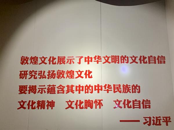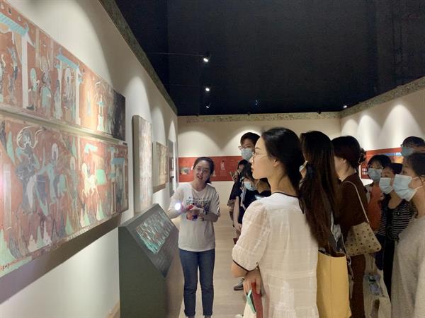 展廳展陳了莫高窟的石窟藝術(shù),分為早期、中期、晚期三個(gè)階段。講解員帶領(lǐng)師生走近敦煌壁畫(huà)藝術(shù),講述莫高窟的大事記。敦煌石窟和敦煌藏經(jīng)洞出土的文物濃縮了中古敦煌的歷史,形象地記載了在開(kāi)放背景下歐亞文明的互動(dòng)、漢民族與其他民族的交融;反映了4—14世紀(jì)一千多年間佛教及藝術(shù)的流傳及流變;保存了豐富生動(dòng)的中外藝術(shù)形象及藝術(shù)的源流傳承;展示了中古時(shí)期廣闊的政治、軍事、文化、科技等社會(huì)生活的場(chǎng)景,具有超越時(shí)空經(jīng)久不衰的魅力,在不同時(shí)代、不同民族、不同信仰、不同地域的人們中間產(chǎn)生共鳴。這也正是中華民族以自己的優(yōu)秀文化為世界做出的貢獻(xiàn)之一。