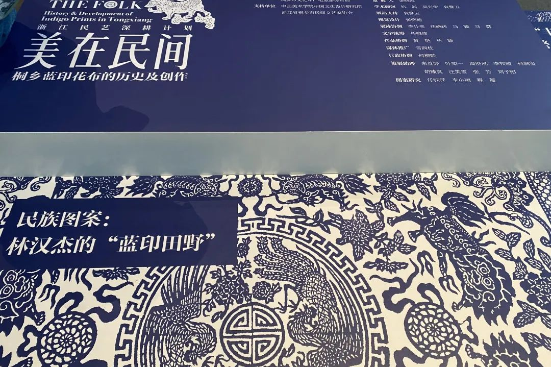 “美在民間——桐鄉(xiāng)藍印花布的歷史及創(chuàng)作”展以桐鄉(xiāng)藍印花布的歷史發(fā)展演進為脈絡(luò),分成“民族圖案:林漢杰的‘藍印田野’”、“走向非遺:藍印花布的近現(xiàn)代發(fā)展”、“新‘豐同裕’:哀警衛(wèi)的繼承與探索”三大模塊,比較全面地展現(xiàn)了桐鄉(xiāng)藍印花布在歷史浪潮中自我發(fā)展,自我更新的過程與風貌。