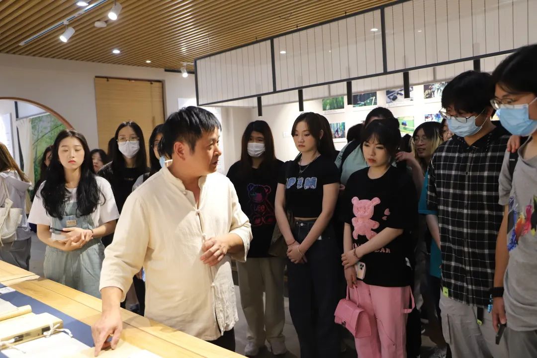 展覽現(xiàn)場(chǎng),朱中華為現(xiàn)場(chǎng)師生講授了富陽竹紙制作技藝的發(fā)展歷史,講述從一根毛竹制作成一張紙的精細(xì)工藝和高超技術(shù)要求。同時(shí)帶領(lǐng)現(xiàn)場(chǎng)師生體驗(yàn)“抄紙”流程,感受傳統(tǒng)技藝的魅力。