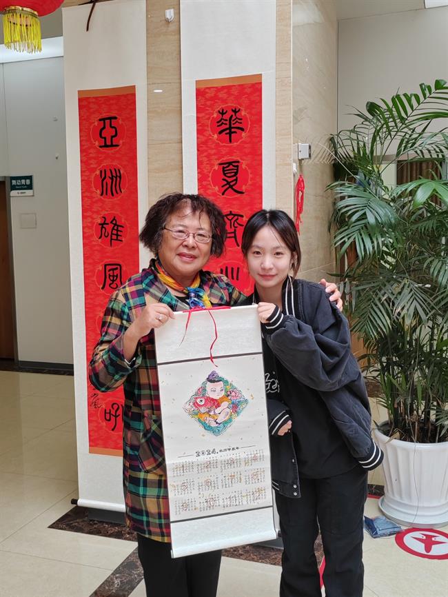 水印木刻活態(tài)體驗(yàn)活動(dòng)中,在“藝小匠”學(xué)生團(tuán)隊(duì)的指導(dǎo)下,老人們蘸取墨水,用刷子為印版上色,均勻地涂抹在刻有傳統(tǒng)紋樣的版面上,對(duì)準(zhǔn)印版平鋪年歷,借助馬蓮來(lái)回旋轉(zhuǎn)按壓,印版上的圖案由此拓印成功,后輔以水彩上色,獨(dú)具特色的新年年歷順利完成。